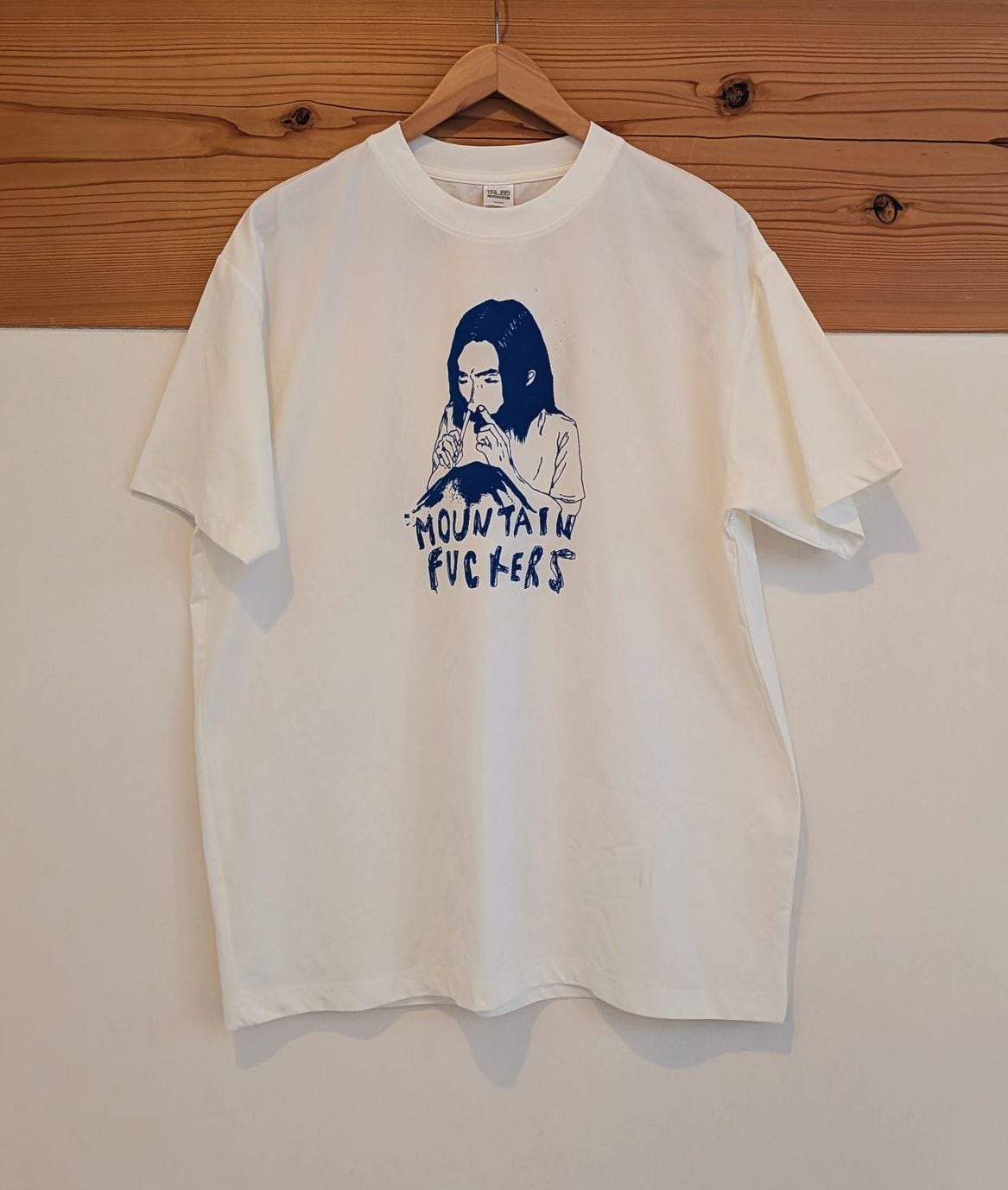 ポリエステル100%コットンライクな4.4オンスの速乾Tシャツです。 ボディカラーはホワイト、プリントはブルーです。