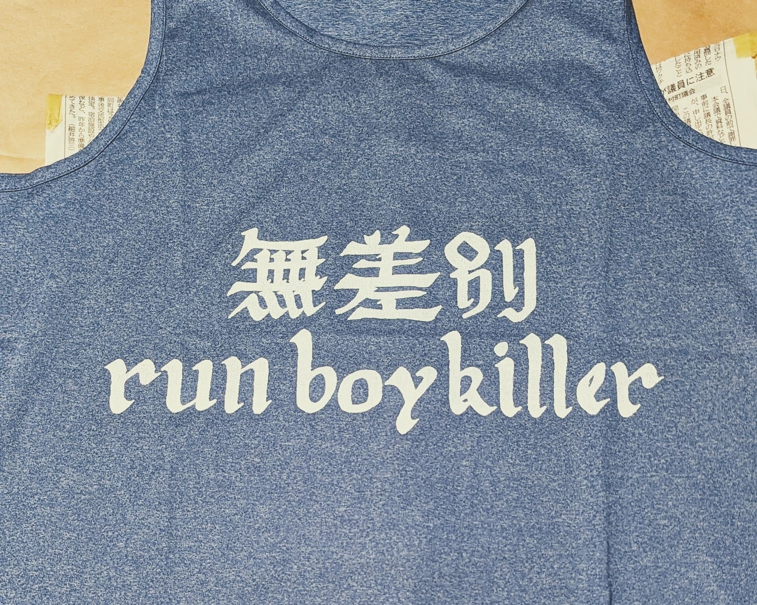 速乾素材でボディは霜降りブルー、プリントは白です。